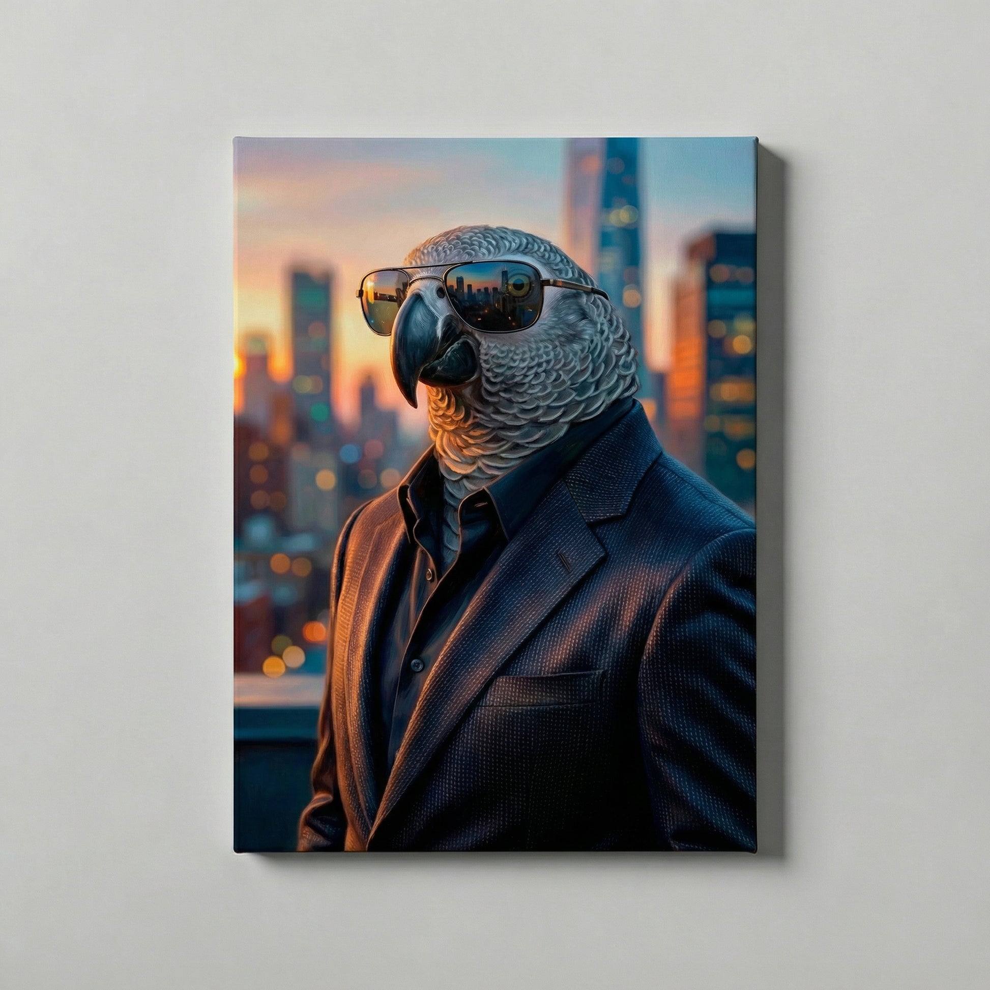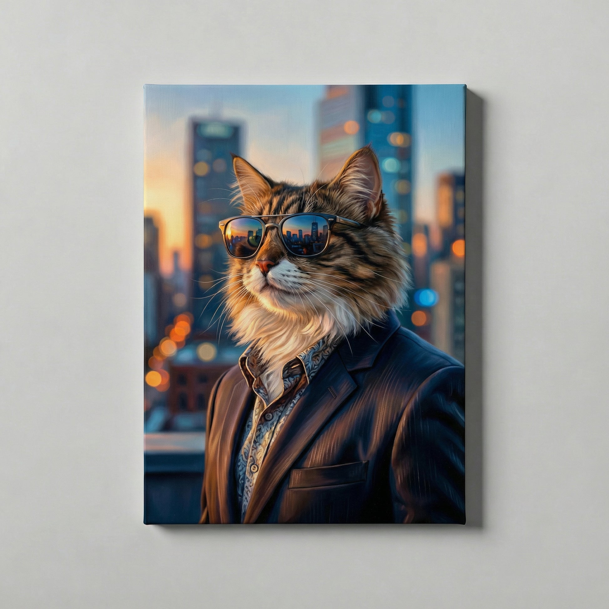 Success looks good on your pet. The Downtown style is designed for the high-flyer who owns the room (and the sofa). Dressed in a sharp, tailored suit and wearing designer sunglasses, your companion is captured against a breathtaking city skyline at sunset.